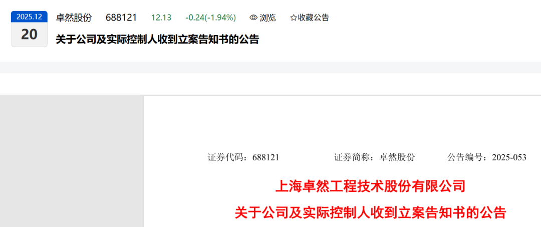 上海卓然工程技术股份有限公司(以下简称 “卓然股份” 或 “公司”)及实际控制人张锦红于 2025 年 12 月 19 日收到中国证券监督管理委员会(以下简称 “中国证监会”)出具的《立案告知书》(证监立案字 0032025031 号、证监立案字 0032025032 号),因涉嫌信息披露违法违规等事项,根据《中华人民共和国证券法》《中华人民共和国行政处罚法》等法律法规,中国证监会决定对公司及实际控制人张锦红立案。