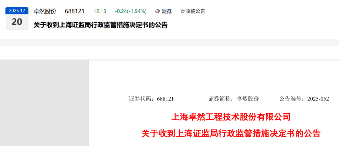 上海卓然工程技术股份有限公司(以下简称 “卓然股份” 或 “公司”)于 2025 年 12 月 19 日收到中国证券监督管理委员会上海监管局(以下简称 “上海证监局”)出具的《关于对上海卓然工程技术股份有限公司采取责令改正措施并对张锦红、吴玉同、张笑毓采取出具警示函措施的决定》(沪证监决(2025)268 号)(以下简称《决定书》),现将有关情况公告如下: